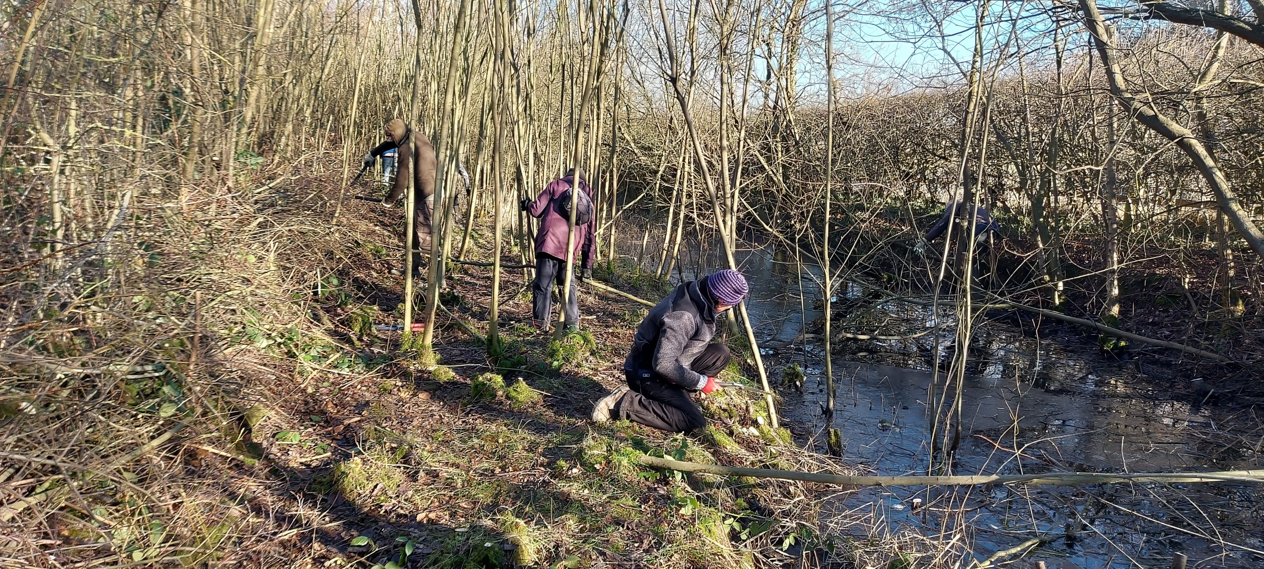 The ditch along the main path to the lake, just up from the bird feeder screen, had become very overgorwn and virtually no light was reaching the water.We set about remedying that situation. lovely bright morning for hacking, lopping and chopping.Pete doesn’t know that in approximately 30 seconds he will slip and get a welly full of icy cold water!Despite the “fresh” temperature, coats were soon off and the results soon become apparent.Objective achieved, lots more light will help create a much better environment for grass snakes and amphibians.